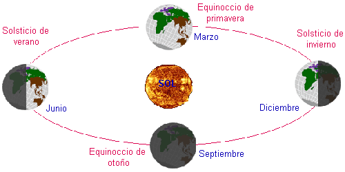 Estas cuatro estaciones están determinadas por cuatro posiciones principales opuestas dos a dos, que reciben el nombre de solsticios y equinoccios.