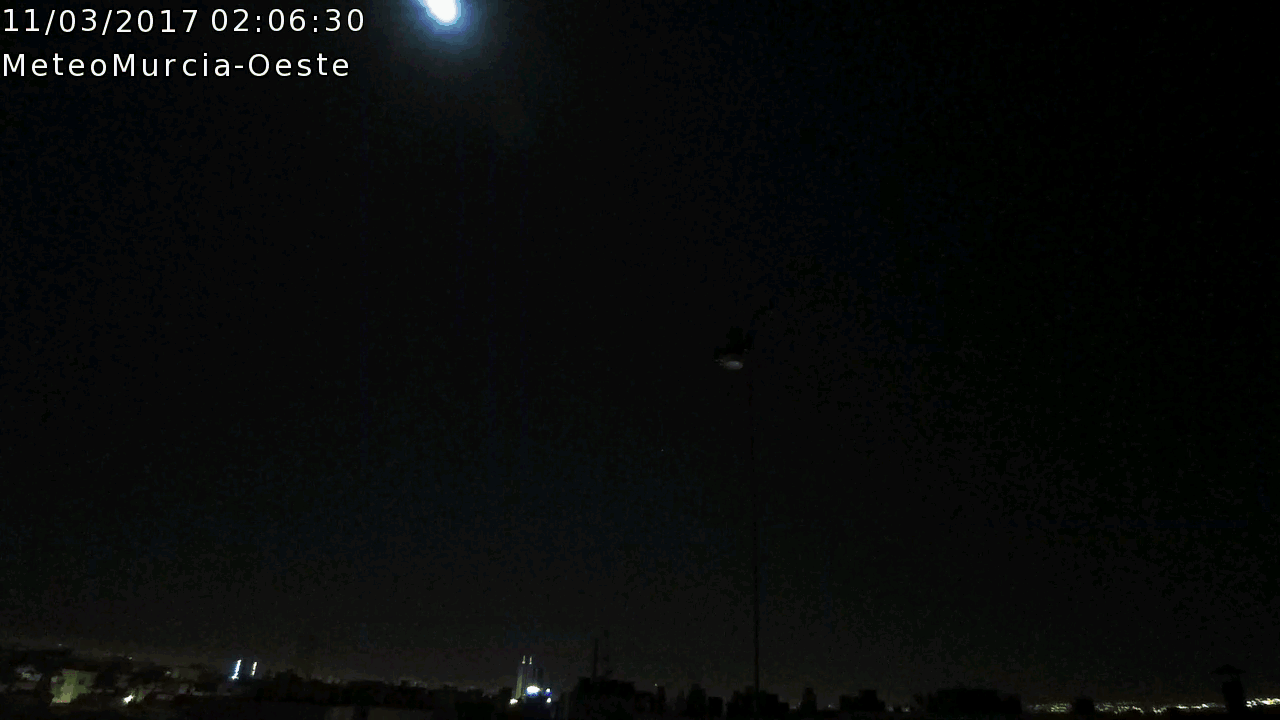Secuencia capatada por la webcam de meteomurcia.com, orientada al oeste, la madrugada del 11-3-17, donde se puede observar en la parte inferior derecha, la espectacular bola de fuego, producida, por la desintegración de un bólido o meteorito, al chocar con la atmósfera.
